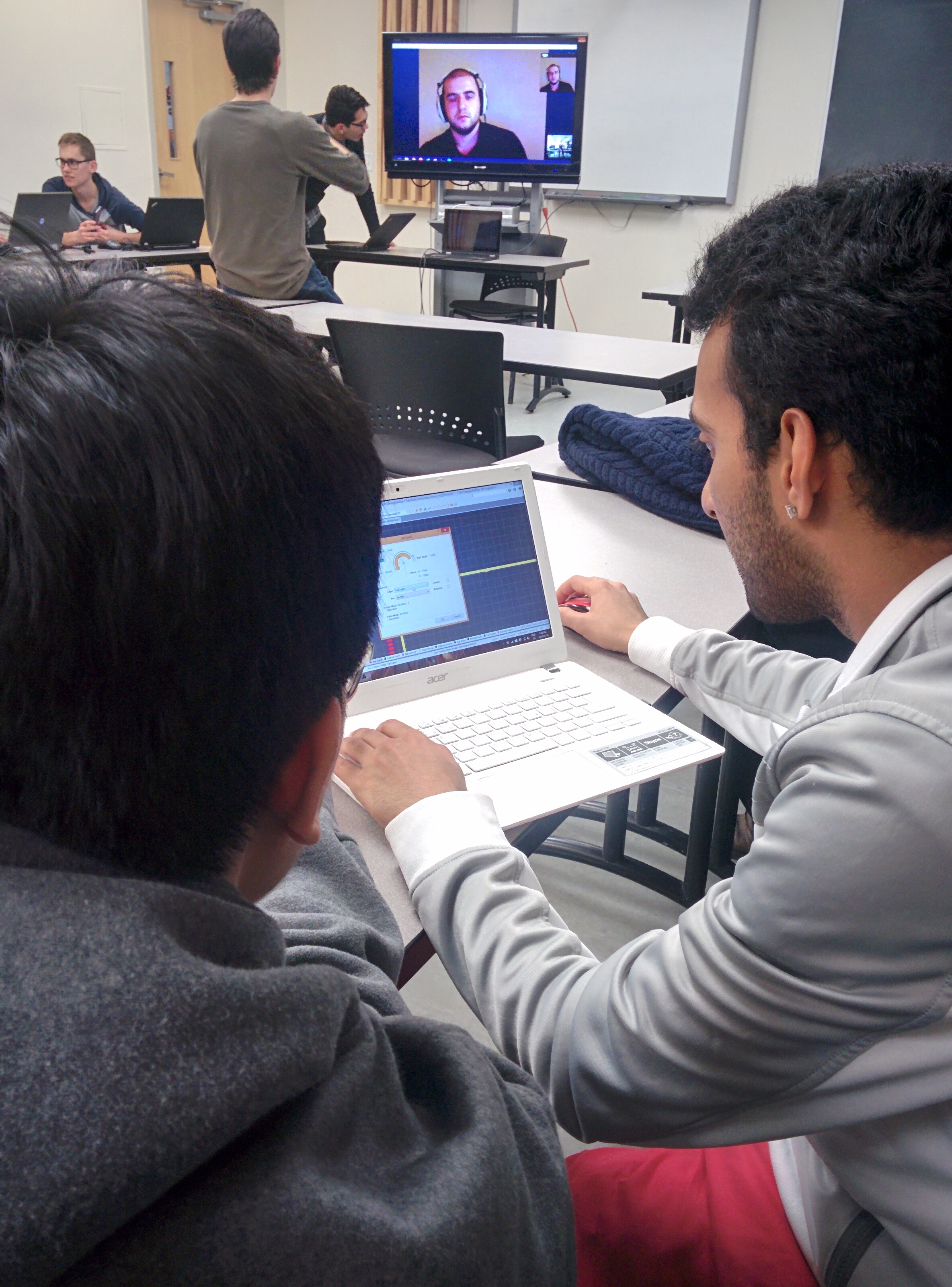 A person wearing a blue jacket with the name 'André' written on it, holding a circuit board or electronic component with yellow labels in an indoor setting.