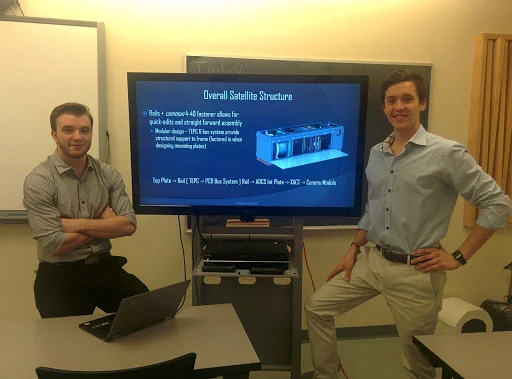 There are many criteria to consider when designing the mechanical structure of a satellite, for example tensile or compression strength, weight, thermal and electrical conductivity, and cost. Chris (pictured left), an automotive and vehicle engineering student, and Ryan (pictured right), a mechanical engineering student, had the challenge of designing the overall structure of the CubeSat with these considerations in mind. Chris and Ryan presented their comprehensive design, down to every nut and bolt, to the NEUDOSE team this past week. Great job guys!