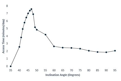 Our orbital analysis specialist, Dawson, created this plot to demonstrate how many minutes a day our team will be able to communicate with our satellite depending on our inclination angle. Inclination angle is the angle our CubeSat will be launched relative to the equator (which is 0 degrees). Our team is looking to launch our satellite in order to get the most communication time - so, our ideal launch angle is around 45 degrees.