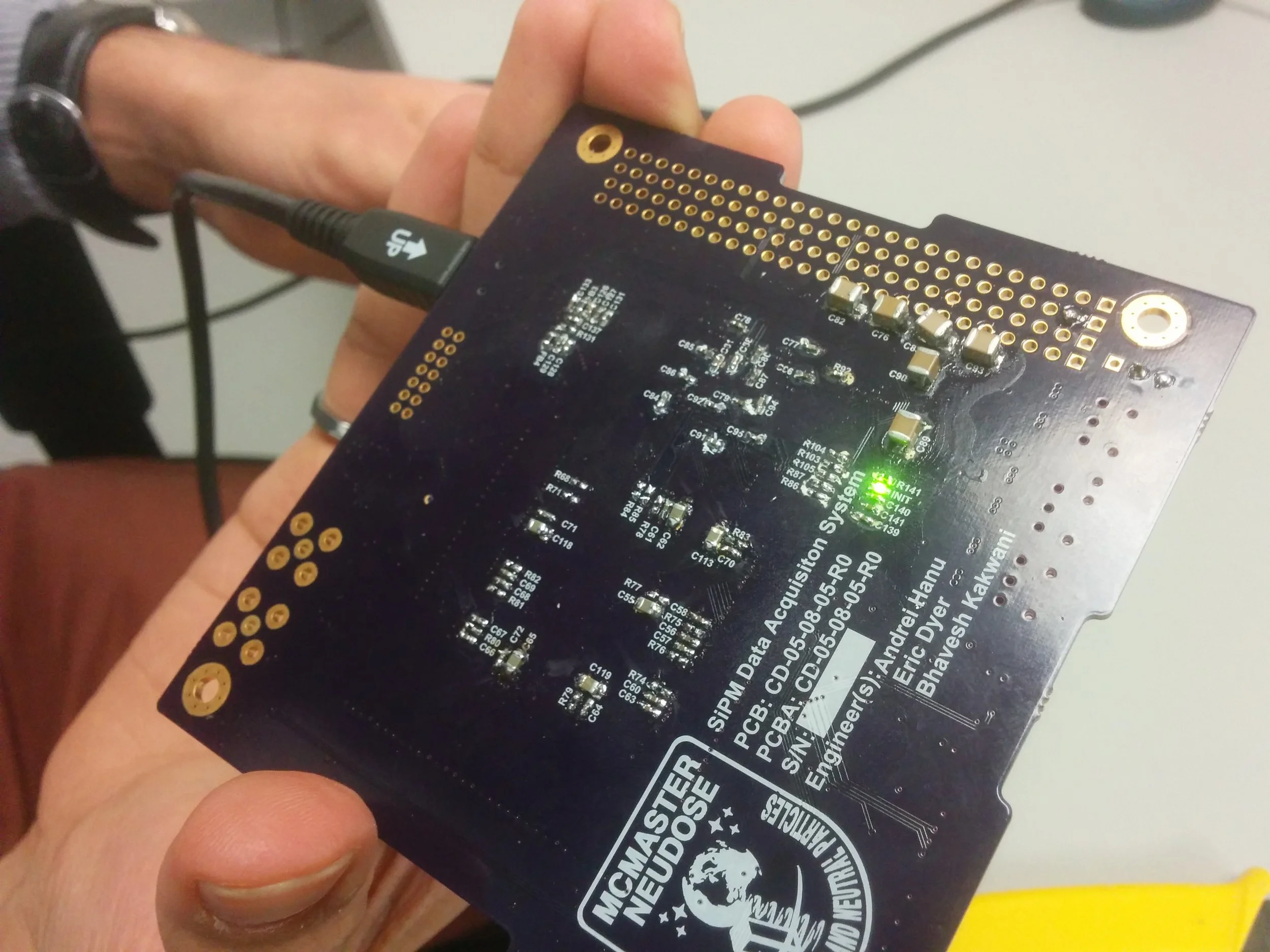 It might be exam season, but the McMaster NEUDOSE team is still working hard on our project! Some of our team members spent an afternoon testing the Silicon Photomultiplier (SiPM) data acquisition board, also designed by our students. This board collects data from the Anti-Coincidence Detector (ACD) of the radiation detection system, and performs preliminary data processing. Take a look at the neat green LED on the board!