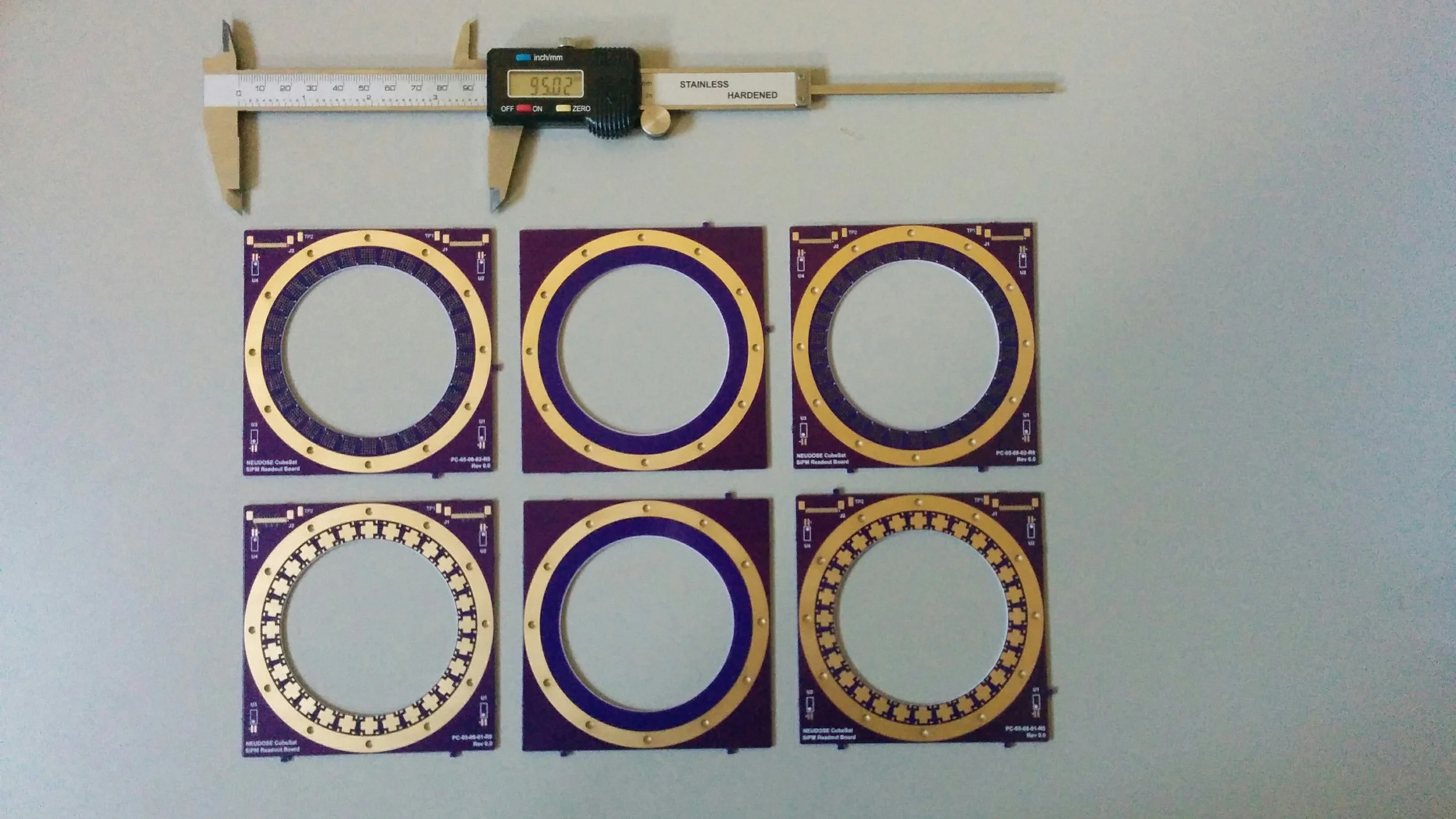 When radiation interacts with the Anti-Coincidence Detector (ACD) onboard the NEUDOSE satellite, light is emitted. Silicon Photomultipliers (SiPMs) amplify this light and turn it into an electrical signal for processing. Shown above are different SiPM readout board designs that will be used for testing purposes.